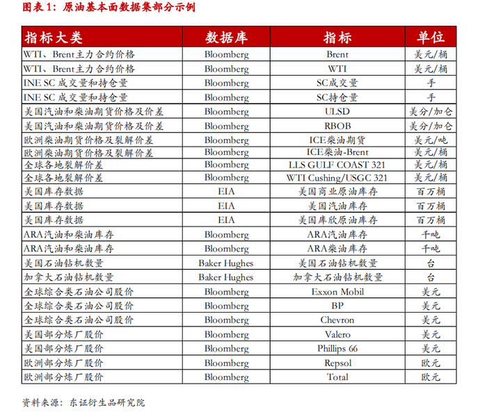 原油是较难择时的品种,为了进一步挖掘有效因子来提升策略择时的表现,利用东证期货“繁微数据库”中的大量基本面数据,我们进一步扩展时间长度和基本面指标覆盖的广度,时间上覆盖了2010年1月以来的基本面数据,以下基本面数据均可以在Bloomberg数据库找到。