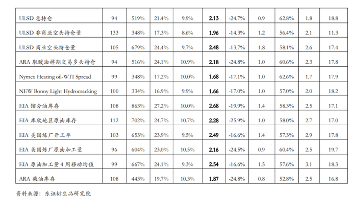 首先是裂解价差这一类指标择时比较有效,其中包括“汽油-WTI裂解价差”、“ICE柴油-Brent裂解价差”,“LLS GULF COAST 321”、“WTI Cushing/USGC 321”为地区裂解价差。