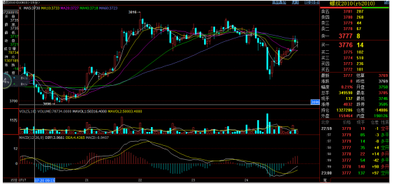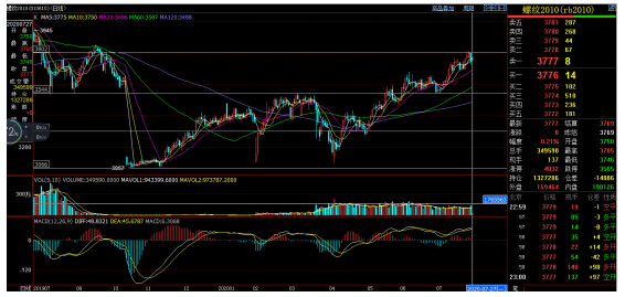 螺纹主力2010合约上周演绎了一颗上影68点、下影25点、实体26点的周阳线,收盘3747点,较前一周涨了21点,周涨幅0.56%。成交量在放大,持仓也在增加。上周的高点3816点应该是整数关口3800点过后的惯性冲刺,之后的量缩回落同是自然而然。这个图表已经跟随了我们很多时日,一切都是这么自然而然。但在这个过程中,其实都是兜兜转转,就像小河流水,方向一致,但一定有沟沟坎坎,一定有逆流之时,但最终会抵达。这样的抵达才有“乐趣”,它考验着人性中的坚韧与退缩,洞见着人性中的贪婪与恐惧。