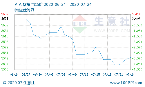 本周原料PTA市场先跌后涨,截止24日市场均价3546元/吨,周环比上涨 0.19%,同比下跌39.58%。受公共卫生事件的影响进一步加剧市场对原油需求前景的担忧,叠加中美关系影响,原油价格出现回落。终端依旧处于淡季,并且下游长丝以及切片利润陷入亏损,在供需压力下周初依旧维持下行,后半周需求面有所提振,价格小幅上行。近期PTA装置变化不大,开工负荷维持89%附近高位,其中嘉兴石化、佳龙石化、蓬威石化、利万新材料、天津石化以及汉邦石化1#仍处于停车阶段,重启时间待定。预计进入8月宁波台化、华彬石化均在有停车检修计划,不排除存在意外检修停车的可能。