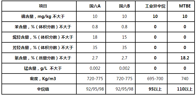 工业异辛烷与MTBE在指标方面都存在低烯烃,低芳烃以及低苯的优势,在汽油升级当中都是较为清洁的调油原料。其中MTBE比异辛烷更大的优势就是辛烷值要更高。但是MTBE最大的劣势在于氧含量较高,在汽油添加当中最大的比例不能超过14%。