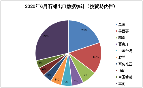 从海关数据了解到,6月份石蜡出口按消费国来看,美国位居首位,出口量在1.06万吨,占总出口量的20%,环比增幅184%。位居第二位的墨西哥出口在0.83万吨,占总出口量的16%,环比降幅16%。位居第三位的是越南,出口资源在0.39万吨,占总出口量的7%。