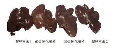 研究发现,使用陈化玉米饲养的猪,其肝脏较使用新鲜玉米饲养的猪大很多,以110kg的猪为例,每个肝脏陈化玉米组比新鲜玉米组重500克左右,且肝脏颜色发黄。