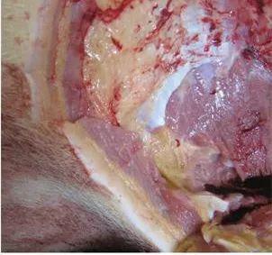 由于陈化玉米的价格要比正常玉米价格低200~300元/吨,迫于成本压力,不少饲料企业拍买了2013年和2014年的陈化玉米,在检测霉菌毒素不超标后,开始在中大猪饲料中使用。通常,在使用陈化玉米的1~2个月后,会开始出现黄膘肉问题,即便立即停用,仍会持续3~4 个月。