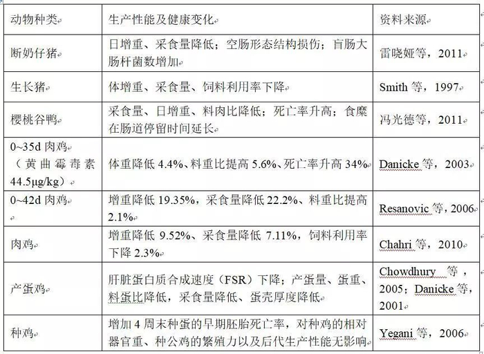 陈化粮霉菌毒素污染复杂,毒素种类繁多,主要包括黄曲霉毒素、呕吐毒素、玉米赤霉烯酮、赭曲毒素以及烟曲霉毒素等。饲喂霉菌毒素污染的粮食会使动物生产性能下降,主要表现在日增重、采食量降低、饲料利用率下降等方面(如表所示)。