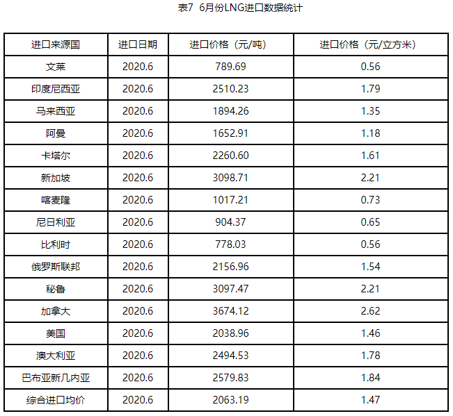 从华东地区接收站方面来看,如东接收站为例,上海自提,如东接收站LNG资源到达上海价格在1.97-2.04元/方,表2推算的俄气到达上海价格为1.92元/方,但值得注意的是,此价格是按照北段最低管输费计算而来,随着中俄东线中、南段的陆续投产,新的管输价格将会重新制定,届时,长输管道和接收站谁领风骚还值得商榷。但照目前海气进口价格来看,海气在华东地区是具有一定价格优势的,表7为6月份LNG进口来源国价格统计,6月份我国LNG综合进口均价为1.47元/方,低于俄气到华东地区价格。