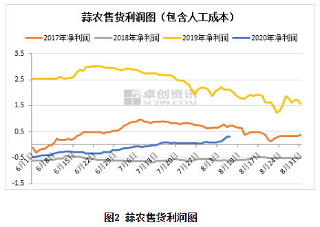 2020年夏收大蒜销售阶段蒜农的售价超过预期,即便金乡、河南及河北等地的大部分蒜农在7月中上旬完成了货源出售,前期售货的蒜农并未卖上高价,但从历史种植年份总结来看,2017-2020年蒜农盈利的年份多于亏损的年份,2018年因亏损较多而减种的蒜农硬生生错过了2019年的暴利年份。因此2020年秋播大蒜种植面积的减种预期在下降。
