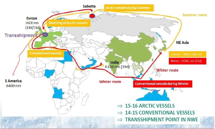 亚马尔贸易公司航运部主管薇罗尼卡•马拉维科表示,北极东北航道(途径白令海峡至远东)相较于传统的南行航道(途经苏伊士运河),无论从航行时间、距离还是燃油成本,都将大为缩短或减少,同时CO2的排放量也将减少30%~40%。