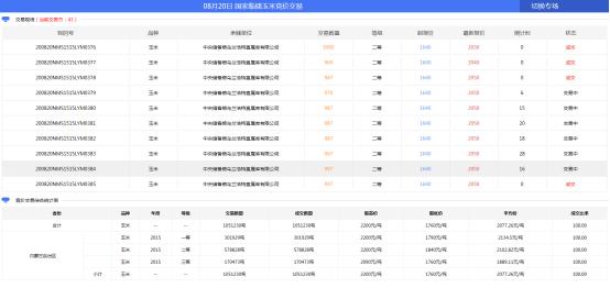 按照临储收购和往年拍卖成交量推算,今年临储玉米开始拍卖前,存量预计在5800万吨左右,加上中储粮一次性储备玉米拍卖等,正在销售的政策玉米接近8000万吨。截至8月20日,2020年国家临储玉米拍卖、国储轮换和一次性储备拍卖累计成交预计超过5600万吨,国家粮库即将被拍空了。无论是贸易商还是企业都担心国家粮库没粮后,玉米市场会是什么样子,以前还传言进口放宽以及其他替代品大量清库,但是从目前来看,国内玉米短期已经是必然结果。这就使得贸易商有信心参拍,企业不得不参拍,所以临储玉米必然成交率高,甚至出现疯狂竞价的现象。