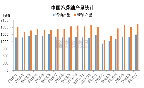 卓创数据统计,2020年7月中国汽油消费量为1182.65万吨,环比下跌1.71%,同比下滑8.94%;中国柴油消费量为1403.42万吨,环比小跌0.72%,同比下跌8.41%。