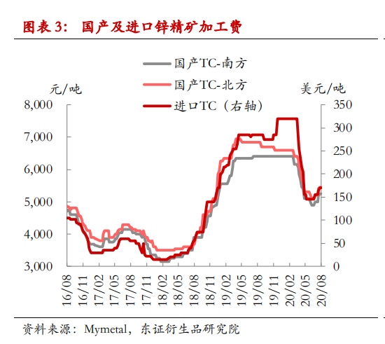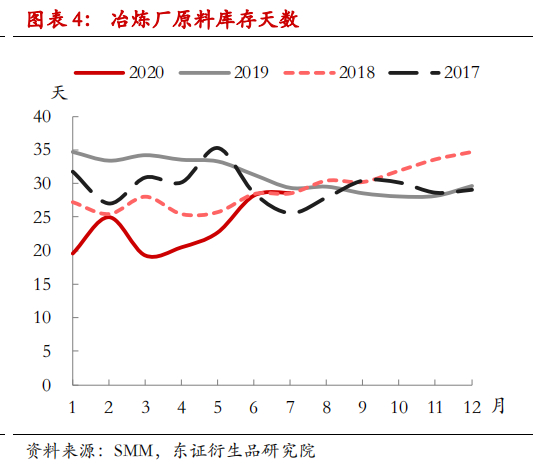 目前,国内的矿山生产已逐步恢复,疫情对海外矿山的扰动也边际趋弱,矿最紧缺的时期已经过去。从价格来看,国产及进口锌精矿加工费均于7月初企稳回升;从冶炼厂原料库存天数来看,目前冶炼厂平均原料库存天数28.56天,较3月的19.3天回升了近10天,原料储备相对充足。