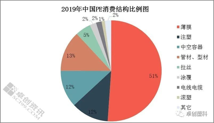 2019年中国聚乙烯消费增长的主要动力来自于电商与网购行业的发展,工业包装升级,农作物的科学种植,食品包装行业发展和二胎政策促使卫材需求大幅度增长,及物流运输包装升级。从消费结构来看,塑料薄膜、注塑和拉丝占比较去年下滑1个百分点,分别在51%、12%和5%,主要终端市场增速放缓的影响。中空占比维持稳定在12%,且近年来IBC桶、食品医药相关的包装发展较为稳健。受城镇化管网建设、煤改气政策的激励推动管材在消费结构占比中提升2个百分点,升至13%。涂覆、电线电缆、滚塑等小众领域消费发展平稳,占比在1%-2%。