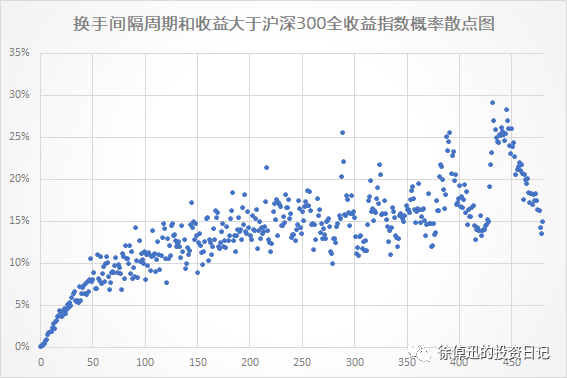 如果以认可度最高的沪深300指数为基准测算,按照全市场投资者平均换手周期模拟,高于沪深300全收益指数的收益率只有9%。即使拉长换手周期,也只有
