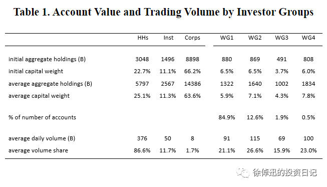 上海证券交易所资本市场研究所所长施东辉在《Wealth Redistribution in the Chinese Stock Market: the Role of Bubbles and Crashes》一文中提到了各类账户的期初市值、平均市值和换手情况。