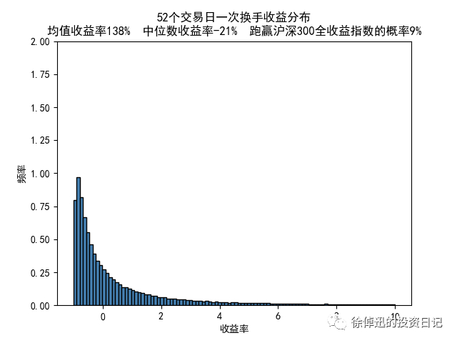 按照全市场的平均换手周期(52个交易日)测试,投资者的收益情况有所改善,投资者的均值收益率达到了138%,有38%的投资者获得了正收益,中位数收益率-21%,跑赢沪深300全收益指数的概率只有9%,有91%的投资者收益无法超过沪深300全收益指数。