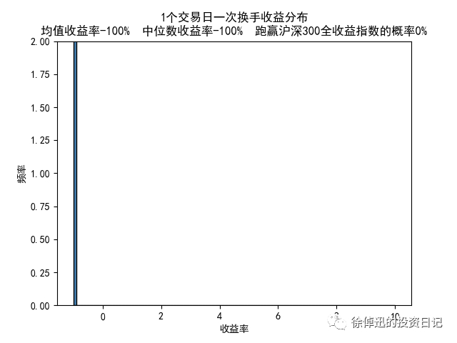 现实情况下,这帮投资者没有这么多钱可以亏,有可能亏到后期连一手股票都买不起了。所以这个模拟的收益率是一个假设本金无限的概念,在本金有限的情况下,亏到后期投资者在全市场都找不到能买一手的股票了。事实上我把1~480天进行一次换仓的情况都测了,做成了动图,直接放结果。为了动图前后的可比性和美观性,我在作图时将坐标轴固定了下来。