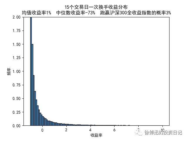 按照散户的平均换手周期(15个交易日)测试后,我惊人的发现绝大多数的投资者都是亏钱的,这些投资者均值收益率只有1%,中位数收益率只有-73%。累计收益率大于0的概率是只有21%,头部21%的散户投资者赚走了尾部79%散户投资者的钱,散户投资者跑赢沪深300全收益指数的概率只有3%。而十万个散户头部的这一位幸运儿,最终获得了270倍的回报,真是一将功成万骨枯。