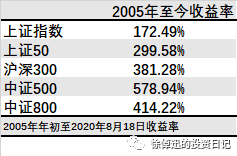 从2005年开始至2020年8月18日实验结束,A股主流指数的收益率如下。