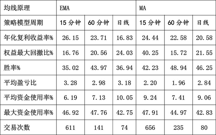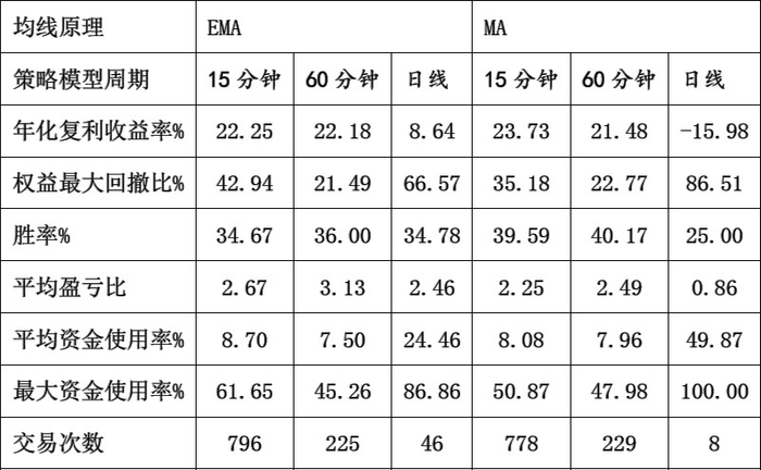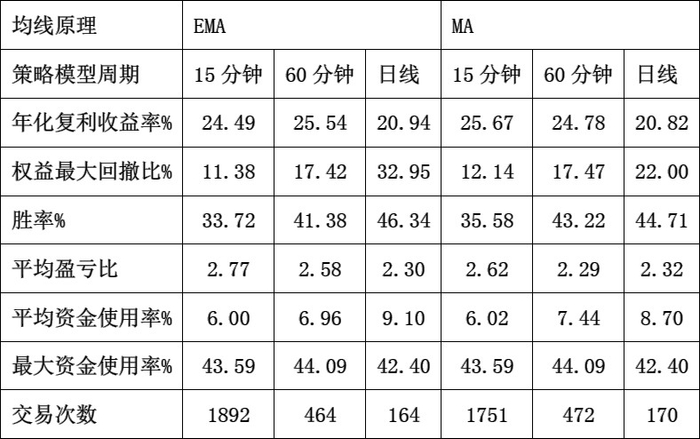 表4为多均线EMA和MA15分钟、60分钟和日线周期效果比较