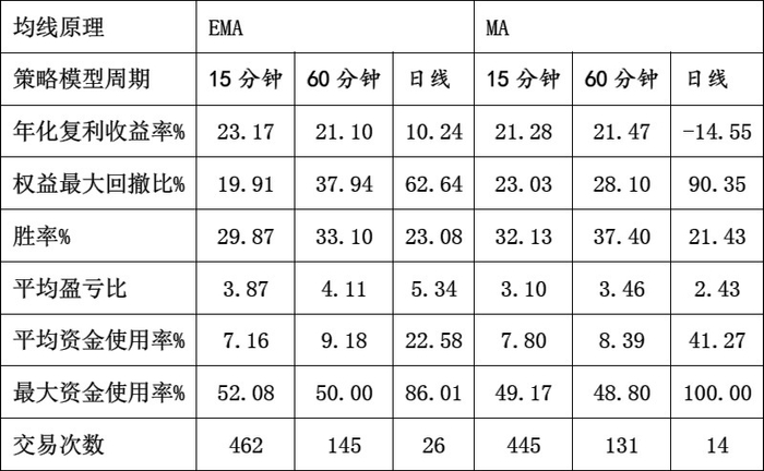 表1为单均线EMA和MA15分钟、60分钟和日线周期效果比较