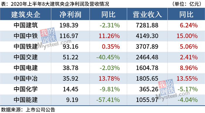 从净利润及营收数据来看,8大建筑央企上半年营业总额达22435.21亿元,合计实现净利润557.99亿元,其中3家同比实现正增长,分别是中国中铁、中国铁建及中国中冶;5家为负增长,中国能建降幅最大,为-57.41%。