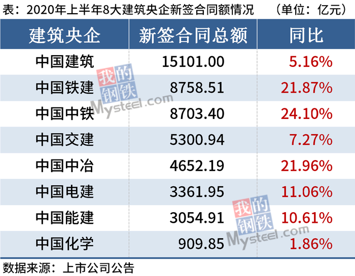 原标题:8大建筑央企2020年上半年新签合同总额近5万亿