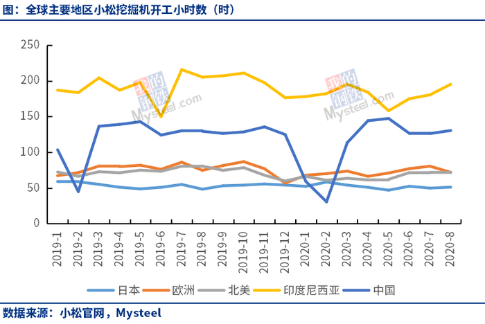 印度尼西亚8月小松挖机开工小时数为195,同比下降4.9%,连续两个月增速为负。