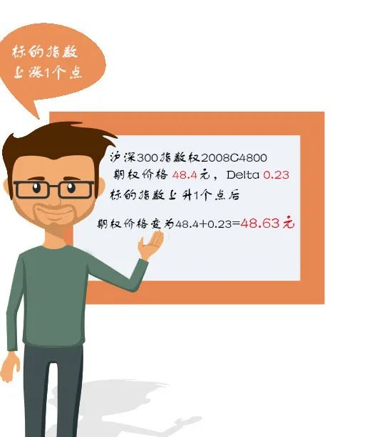 小方:首先要讲的是Delta,他衡量的是标的资产价格变化对期权价格的影响程度。在沪深300指数期权里就是指数每变动一个点,期权价格相应的变化量。黄金法则第一条,Delta的绝对值在0到1之间,看涨期权Delta值为0~1,看跌期权的Delta值为-1~0。