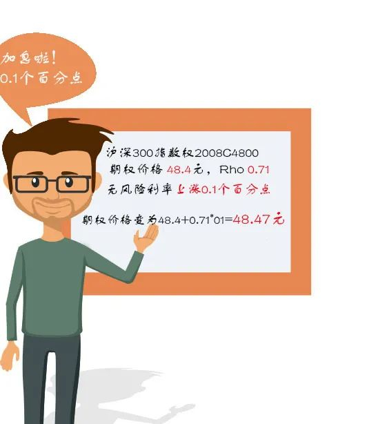 小方:最后我们来看下希腊字母Rho。他衡量的是期权价格对利率变化的敏感性,也就是无风险利率每变动1个百分点,期权价格理论变动金额。简单的记住看涨期权的Rho是正的,看跌期权的Rho是负的。