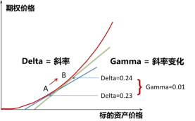 小方:所以才说期货是线性产品,而期权是非线性产品呢!其实Delta就是期权价格曲线上的切线斜率,虽然他在每一特定时点是一个确定值,但标的资产价格一变动,Delta也随之改变。而促使Delta随时变动的幕后推手就是Gamma!如果把Delta值比作汽车的速度,正负号比作汽车前后行驶方向,那Gamma就好比汽车的油门(加速度)。