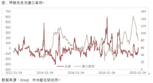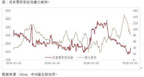 因为每个合约换月导致月差的连续变动无法直观反映其真实的趋势,所以我们可以只关注月差的变动量,而忽略其绝对值。通过计算得到2014年至2020年甲醇的月差累积变动值,发现月差的变动其实是有一定的趋势性的,且变动方向与库存变动趋势整体上呈现负相关,持续时间与库存的趋势性变化基本相当。我们通过将观测月差的绝对值转为观测月差的变动量趋势,在没有改变数据自身所含信息的情况下,印证了上述的逻辑关系。