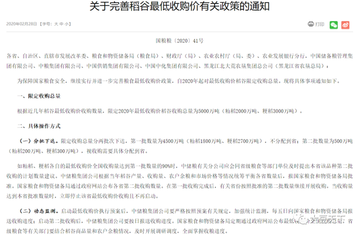 值得我们注意的是,通知中重点提出限定收购总量,“根据近几年稻谷最低收购价收购数量,限定2020年最低收购价稻谷收购总量为5000万吨(籼稻2000万吨、粳稻3000万吨)。”