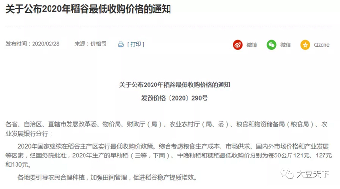 当前是中晚稻正在陆续收割上市的季节,市场对价格比较关注,但是关于2020年稻谷最低收购价格的通知早在今年2月份就已经公布。