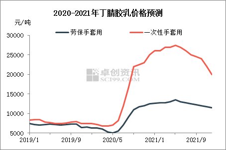 全球卫生事件期间,医疗级手套需求激增,一次性手套用丁腈胶乳价格涨势明显,进而带动劳保手套用丁腈胶乳价格。年后,国内橡胶市场行情低迷,然一次性手套用胶乳逆势而上,尤其近4个月以来,丁腈胶乳涨价幅度明显高于原料及其他橡胶产品,其中一次性医疗级手套用丁腈胶乳市场价格自8000-8500元/吨涨至22000-25000元/吨,个别厂家拉涨至27000元/吨,一直处于不断试探性推涨过程,劳保手套用胶乳价格自4800元/吨涨至9500-12000元/吨,不乏存12000元/吨以上价格。