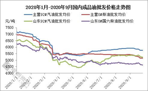 批发价格方面:为控制疫情扩散,国内在2-4月份实行较为严格的封锁政策。除部分应急保障用油外,国内成品油消耗零星。国内炼厂、下游贸易商、终端客户库存压力较为明显,部分炼厂甚至将检修计划提前至一季度,但对市场改善效果微乎其微。虽然4月初期国内全面解除封锁,国内需求逐渐回升,但与往年相比,仍有一定需求缺口。特别是今年雨水天气频繁,南方洪涝灾害影响较为明显。同时因受到疫情冲击,国内部分行业生机恢复有限,需求端表现弱势状况持续存在。受此影响,2020年以来,国内柴油价格呈现明显下跌走势。汽油方面受到夏季空调用油和假期出行影响,需求支撑好于柴油。2020年以来国内汽油价格呈现跌后回涨走势,但综合来看,推动国内汽油批发价格上涨动力有限。截止9月29日,国内主营92#汽油均价为5744元/吨,0#柴油均价为5138元/吨。山东地炼92#汽油均价为5241元/吨,0#柴油均价为4635元/吨。