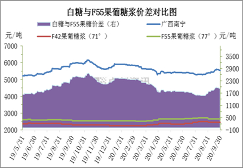 白糖与F55果葡糖浆价差对比