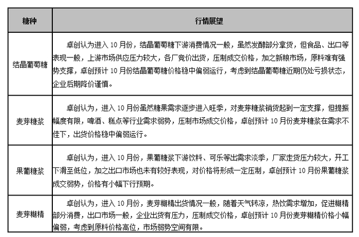 9月份淀粉糖整体运行偏弱,一方面原料玉米价格弱势,随后期有小幅反弹,但反弹有限,成本暂时低位,另一方面,双节备货一般,啤酒、饮料等逐步进入淡季,淀粉糖走货情况不佳。进入10月份,各产品预测如下: