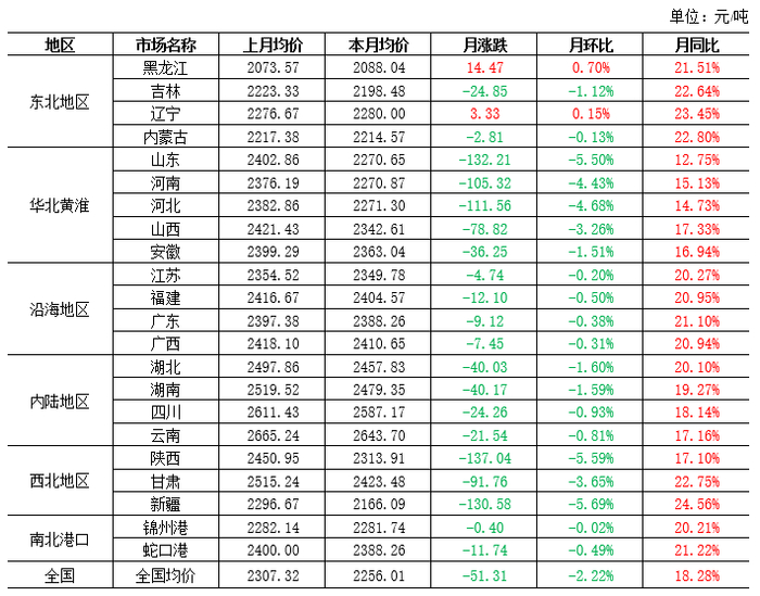 本月玉米价格维持先跌再涨后稳的趋势。9月份初华北地区春玉米继续上市,加上陈粮供应,市场供应相对充足,下游企业连续压价收购,价格持续下调,中旬之后,随着价格不断下探,贸易商开始挺价,下游深加工门前到货量维持低位,下游厂家经过库存消耗,有一定补库需求,加上贸易商普遍看好新粮价格,底部价格不断夯实,玉米开始止跌反弹,月底价格基本维持稳定。截至月底,山东深加工厂主流收购2250-2420元/吨,低端价格较上月底下调60元/吨,高端价格下调40元/吨。月底,山东市场玉米主流价格2180-2350元/吨,较上月低端下调100元/吨,高端价格稳定;河北2200-2330元/吨,较上月低端下调60元/吨,高端下调20元/吨;河南2160-2360元/吨,较上月低端价格下调80元/吨,高端价格维持稳定。