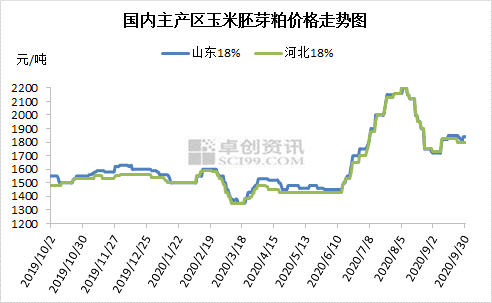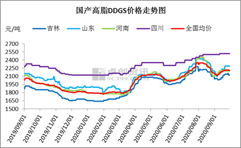 卓创资讯预计,2020年10月国产DDGS均价先稳后跌,高脂均价参考2150元/吨左右。