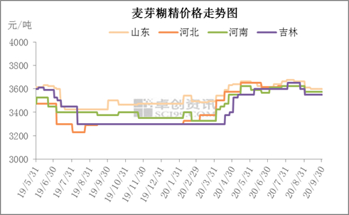 9月份麦芽糊精出货价格稳中偏弱运行,高价有30-50元/吨的下滑。价格下滑主要是下游需求情况一般,出口市场也并未有好转迹象,同比去年较低,导致国内货源供应量大,压制成交价格,高价难以持续,有小幅下滑,但市场低价在基本无盈利情况下,稳价出货。截止到月末,山东地区成交3400-3750元/吨,河北地区成交3450-3650元/吨,东北地区成交3400-3580元/吨,需求不佳下,麦芽糊精开工仍维持低位。
