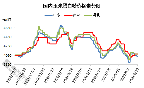 本月玉米蛋白粉价格先涨后跌,均价较上月明显下滑。上旬蛋白粉价格上涨,一方面受豆粕价格上涨支撑,企业挺价心态不断增强,另外下游双节备货节奏提前,市场采购积极性有所好转,支撑当地市场价格上涨;但中旬及下旬,随着新玉米上市增加的季节性压力来袭,叠加需求端备货告一段落后暂无支撑,玉米蛋白粉市场价格再次显现弱势。据卓创统计,本月国内玉米蛋白粉均价4051元/吨,较上月均价跌171元/吨,环比跌幅4.05%,同比跌幅0.31%。值得注意的是,从本月开始玉米蛋白粉价格同比由正转为负值,即蛋白粉在9月的市场均价已经低于去年同期均价。