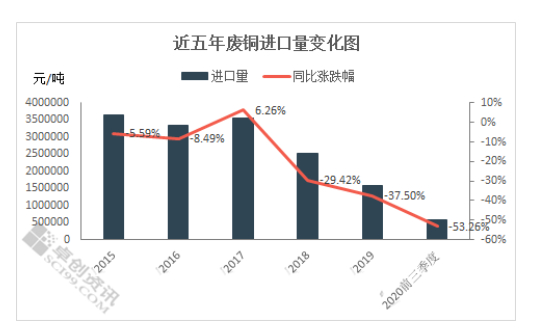 今年截至目前为止,我国废铜料的进口主要是以批文形势进口。截至九月,今年前三季度进口废铜料大概在58万吨,相较去年110万吨,下滑严重,跌幅近53%。