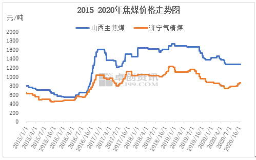 价格方面,2015年年底炼焦煤市场价格创历史新低,之后进入2016年随着煤炭行业供给侧结构改革的进行,煤价触底以后节节攀升,之后2017-2019年炼焦煤市场价格整体以高位震荡运行为主,进入2020年,受供需格局偏宽松影响,上半年炼焦煤市场价格整体以下行为主,下半年触底企稳,部分煤种有小幅反弹,以山西吕梁地区低硫主焦煤为例,价格由年初的1420元/吨降至10月中旬的1270元/吨,年内降幅为10.56%。