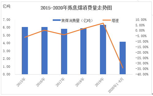 供应方面,2014-2017年炼焦原煤产量整体呈现逐年下降的态势,产量由2014年的8.52亿吨降至了2017年的6.89亿吨,产量降幅为19.13%,这期间产量大幅下降主要是因为从2016年开始煤炭行业实行煤炭供给侧结构改革,煤炭产量下降明显,炼焦原煤产量也同样受影响。从2018年开始至2020年,煤炭行业逐步由去产能转向了有效保供应,煤炭先进产能不断释放,煤矿276个工作日制度不在严格执行,因此煤炭产量整体呈现增加态势,2018年炼焦煤产量增加至7.03亿吨左右,2019年全国焦煤产量为7.4亿吨左右,同比增幅0.53%。进入2020年焦煤产量仍有小幅增加空间,其中1-8月炼焦原煤产量为4.87亿吨,同比增幅为1.88%。