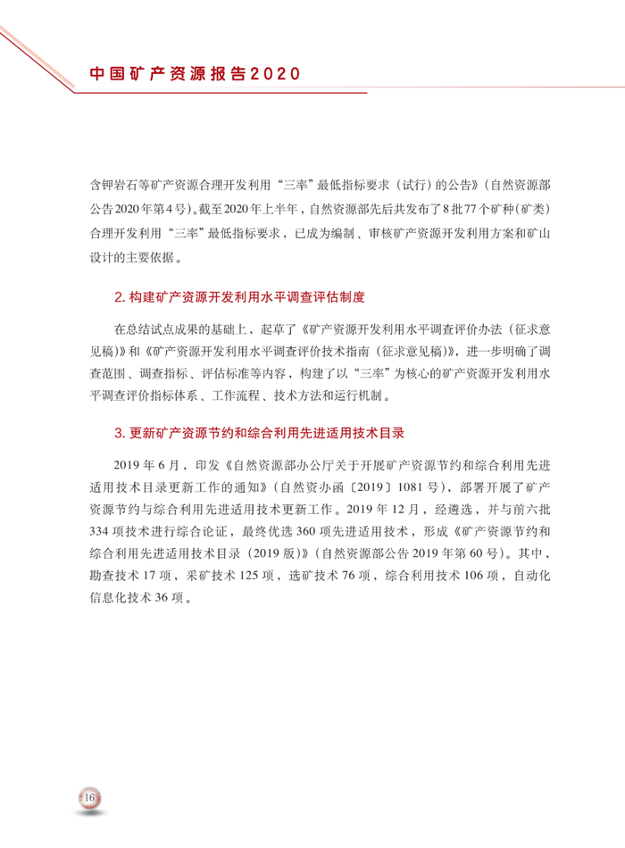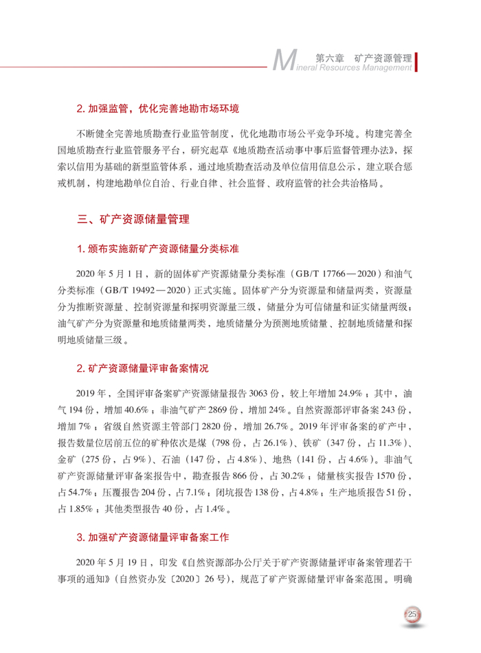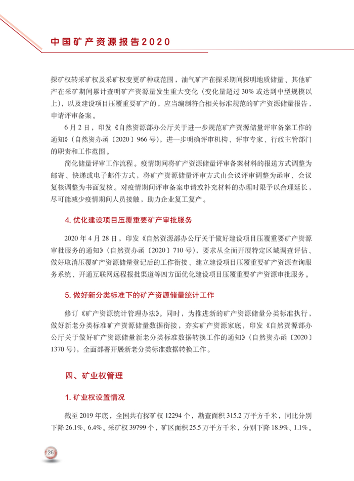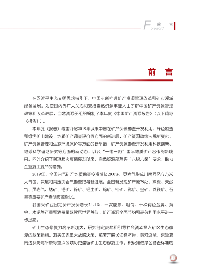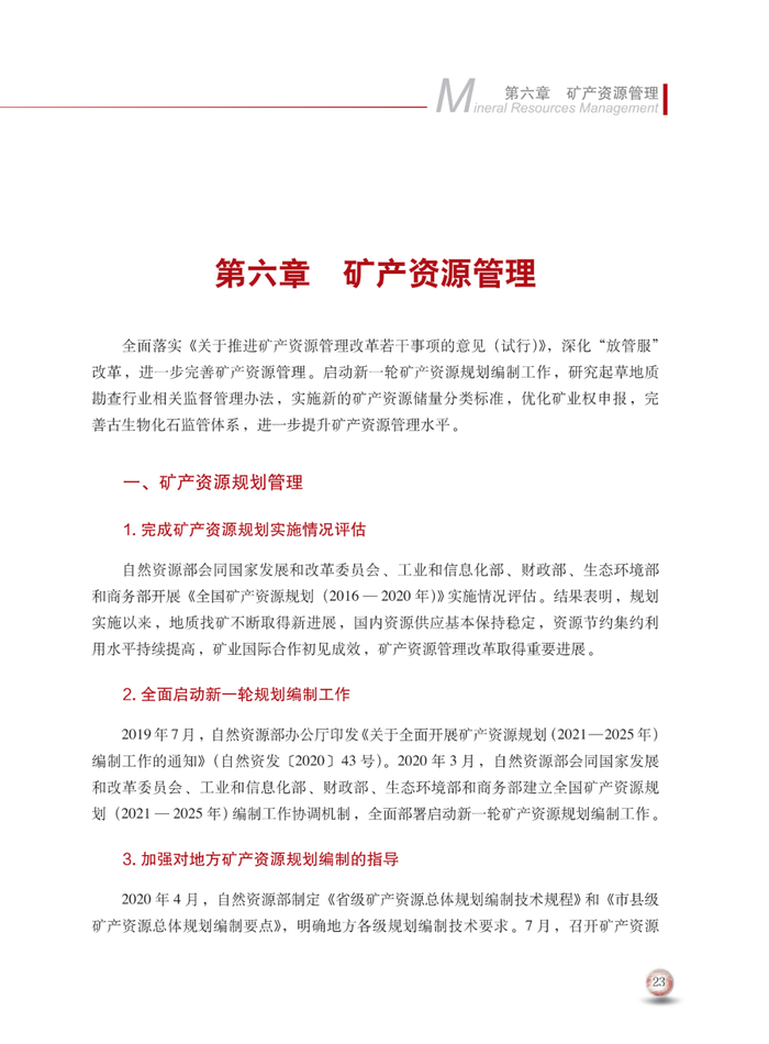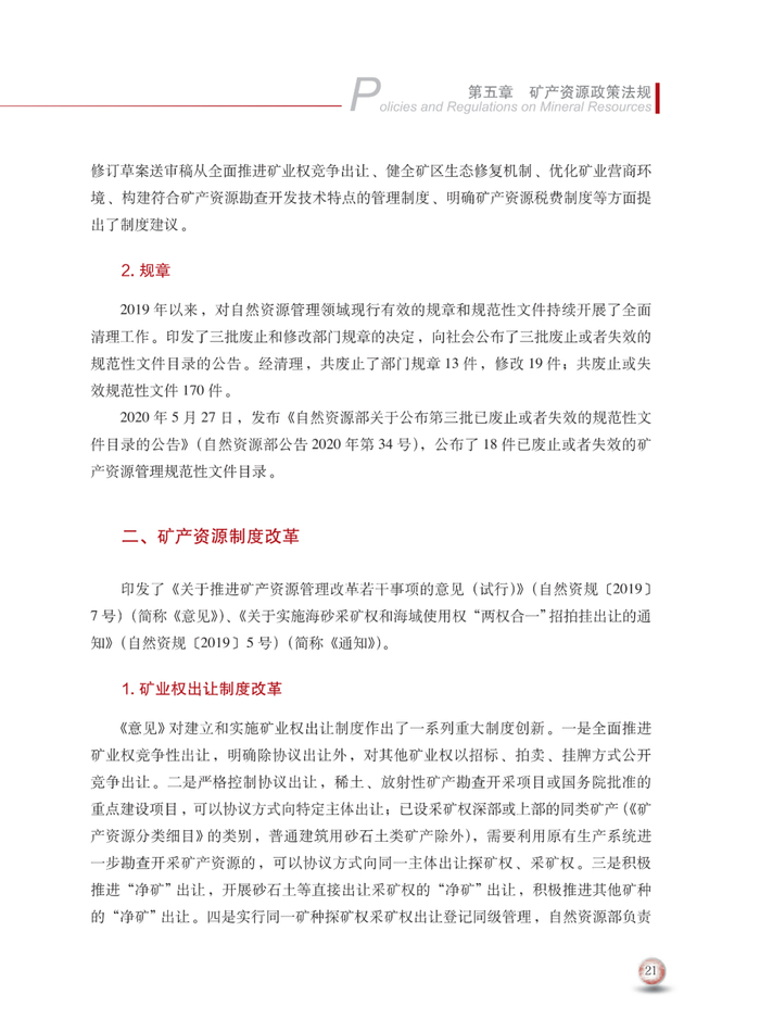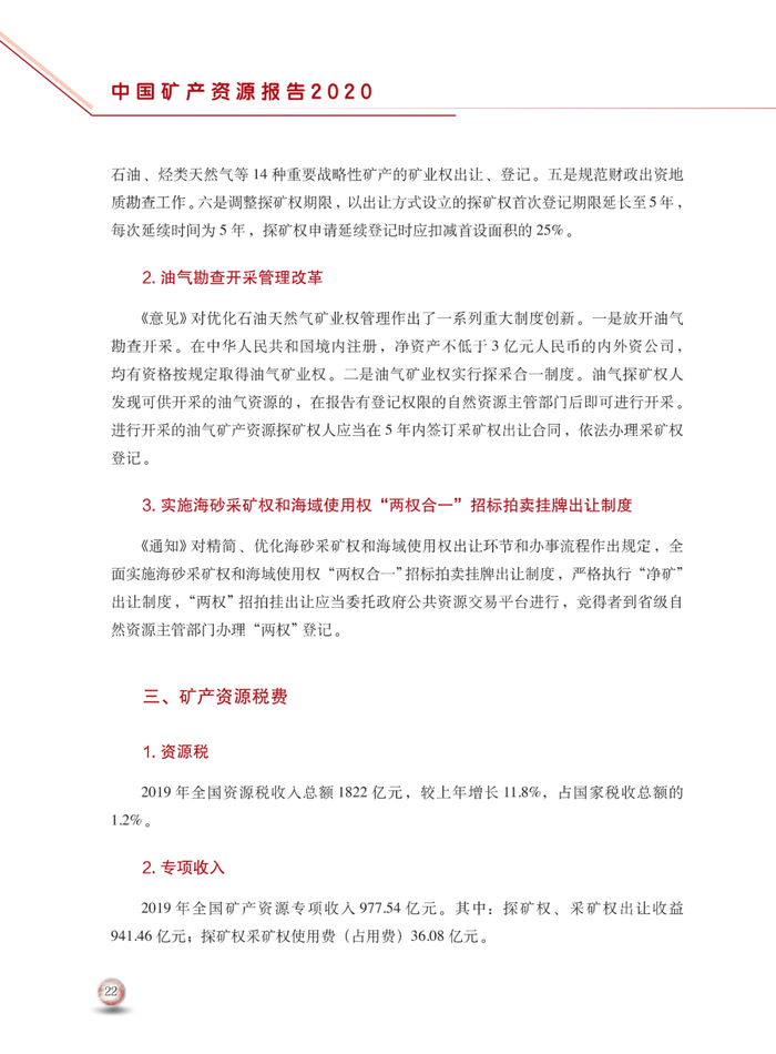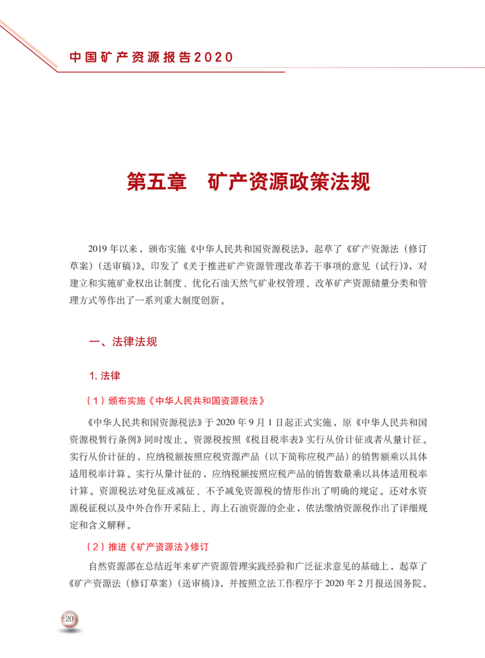 2019年以来,颁布实施《中华人民共和国资源税法》,起草了《矿产资源法(修订草案)(送审稿)》。印发了《关于推进矿产资源管理改革若干事项的意见(试行)》,对建立和实施矿业权出让制度、优化石油天然气矿业权管理、改革矿产资源储量分类和管理方式等作出了一系列重大制度创新。