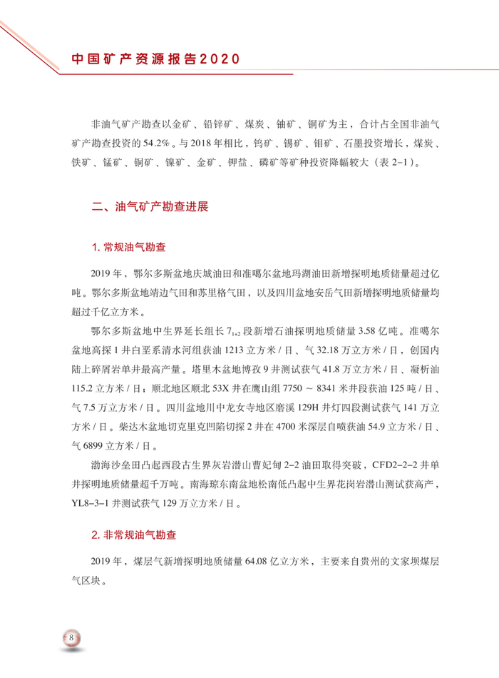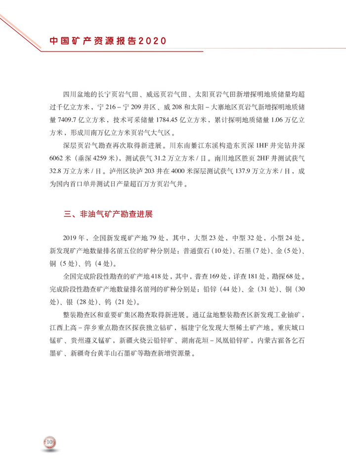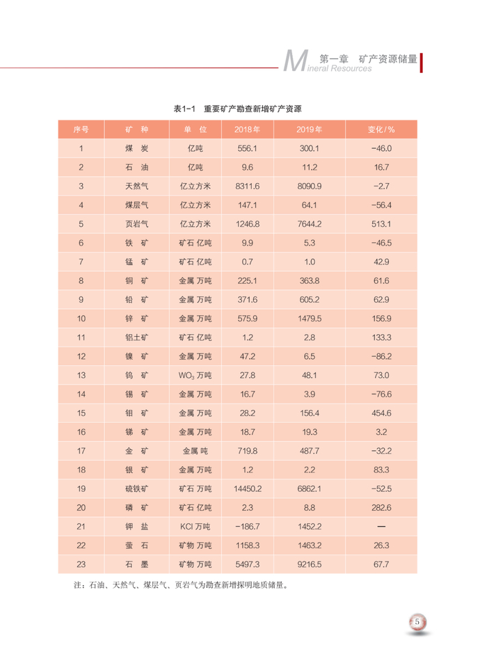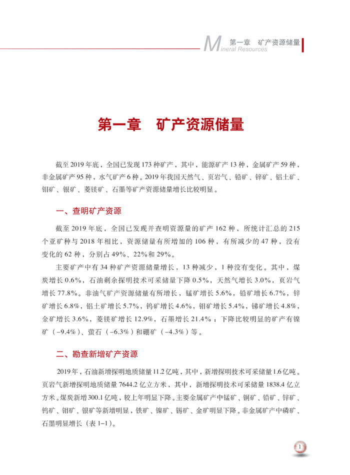 SHPGX导读:自然资源部发布《中国矿产资源报告2020》。截至2019年底,全国已发现173种矿产,其中,能源矿产13种。2019年我国天然气、页岩气、铅矿、锌矿、铝土矿、钼矿、银矿、菱镁矿、石墨等矿产资源储量增长比较明显。