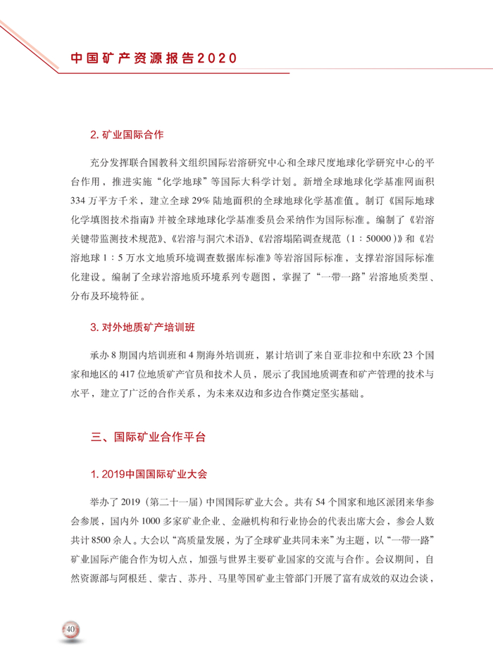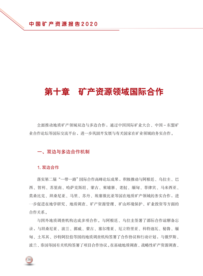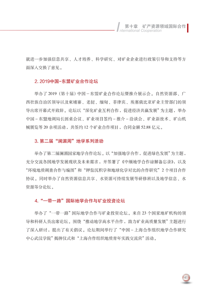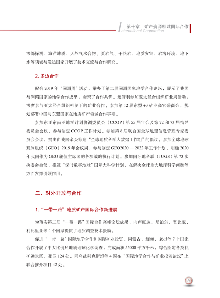 全面推动地质矿产领域双边与多边合作,通过中国国际矿业大会、中国-东盟矿业合作论坛等国际交流平台,进一步巩固并发展与有关国家在矿业领域的务实合作。