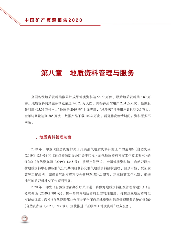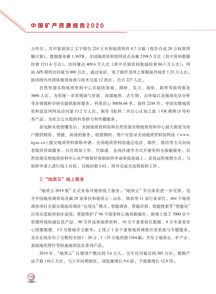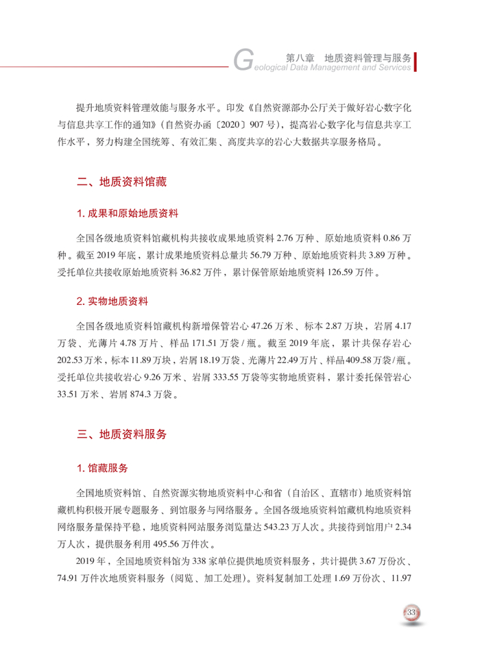 全国各级地质资料馆藏累计成果地质资料达56.79万种、原始地质资料共3.89万种。地质资料网站服务浏览量达543.23万人次。共接待到馆用户2.34万人次,提供服务利用495.56万件次。“地质云2019 版”上线应用,“地质云”注册用户数达到3.6万人,全年访问量达到385万次,数据产品下载110.2万次。新冠肺炎疫情期间,资料服务不间断。