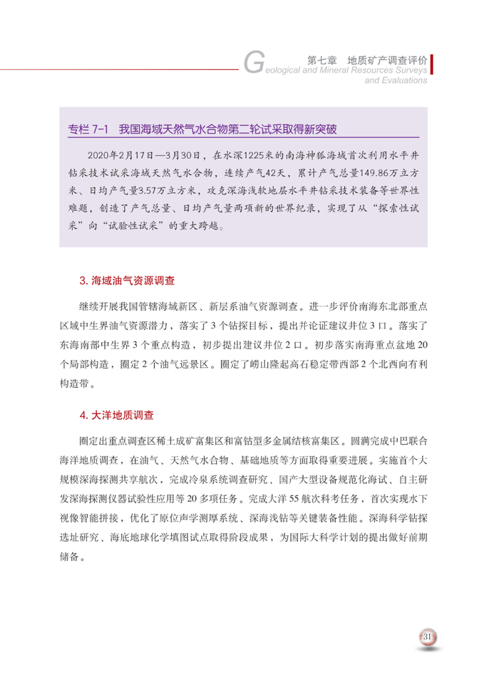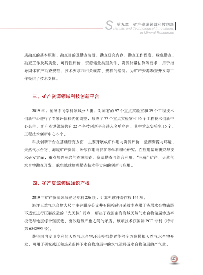 2019年,矿产资源领域研究成果显著,两项成果获得国家科学技术奖。申请多项发明专利,进一步加强对矿产资源知识产权的保护。推进矿产资源领域科技创新,建设多个重点实验室和工程技术创新中心。推进地质矿产的标准化工作,为地质矿产行业高质量发展提供了技术保障。