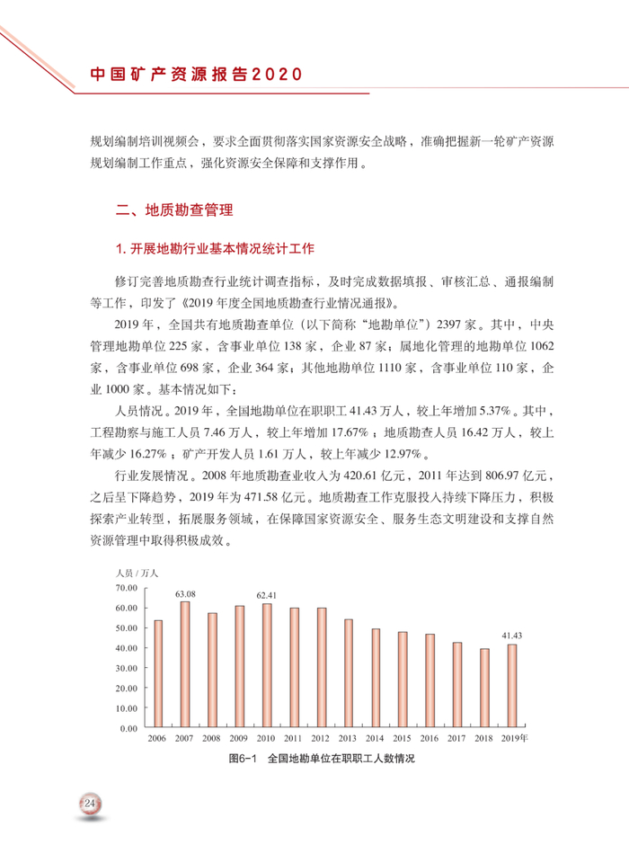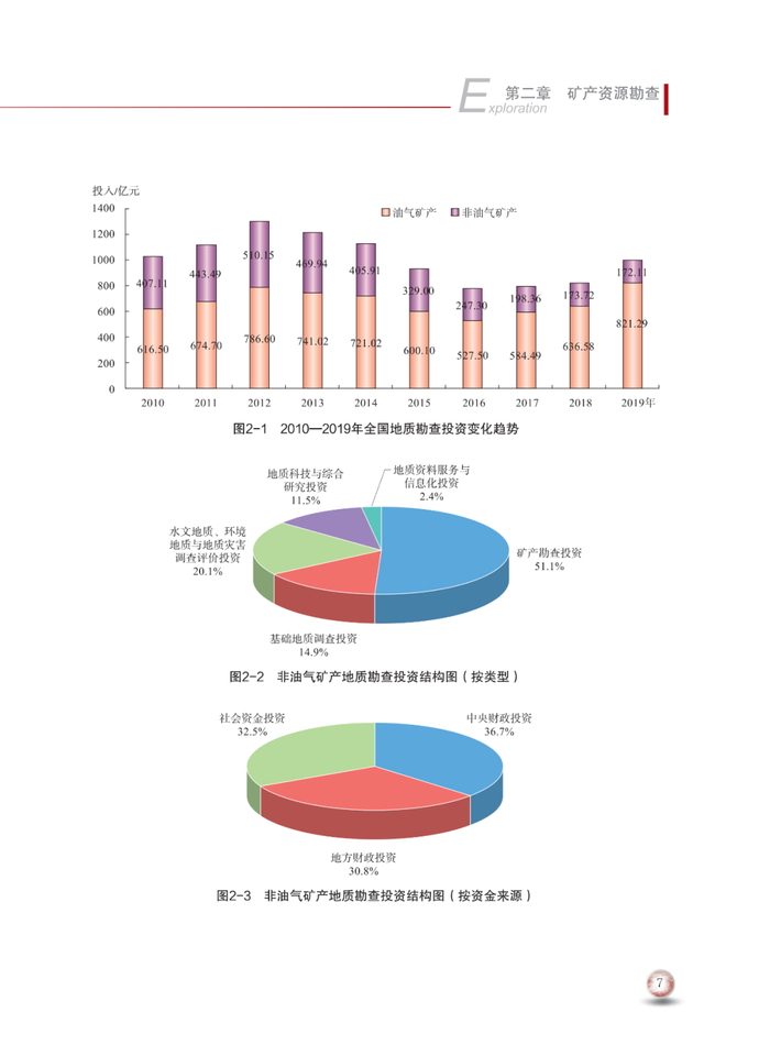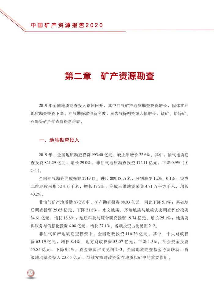 2019年全国地质勘查投入总体回升,其中油气矿产地质勘查投资增长,固体矿产地质勘查投资下降。油气勘探取得新突破,页岩气探明资源大幅增长。锰矿、铅锌矿、石墨等矿产勘查取得新进展。